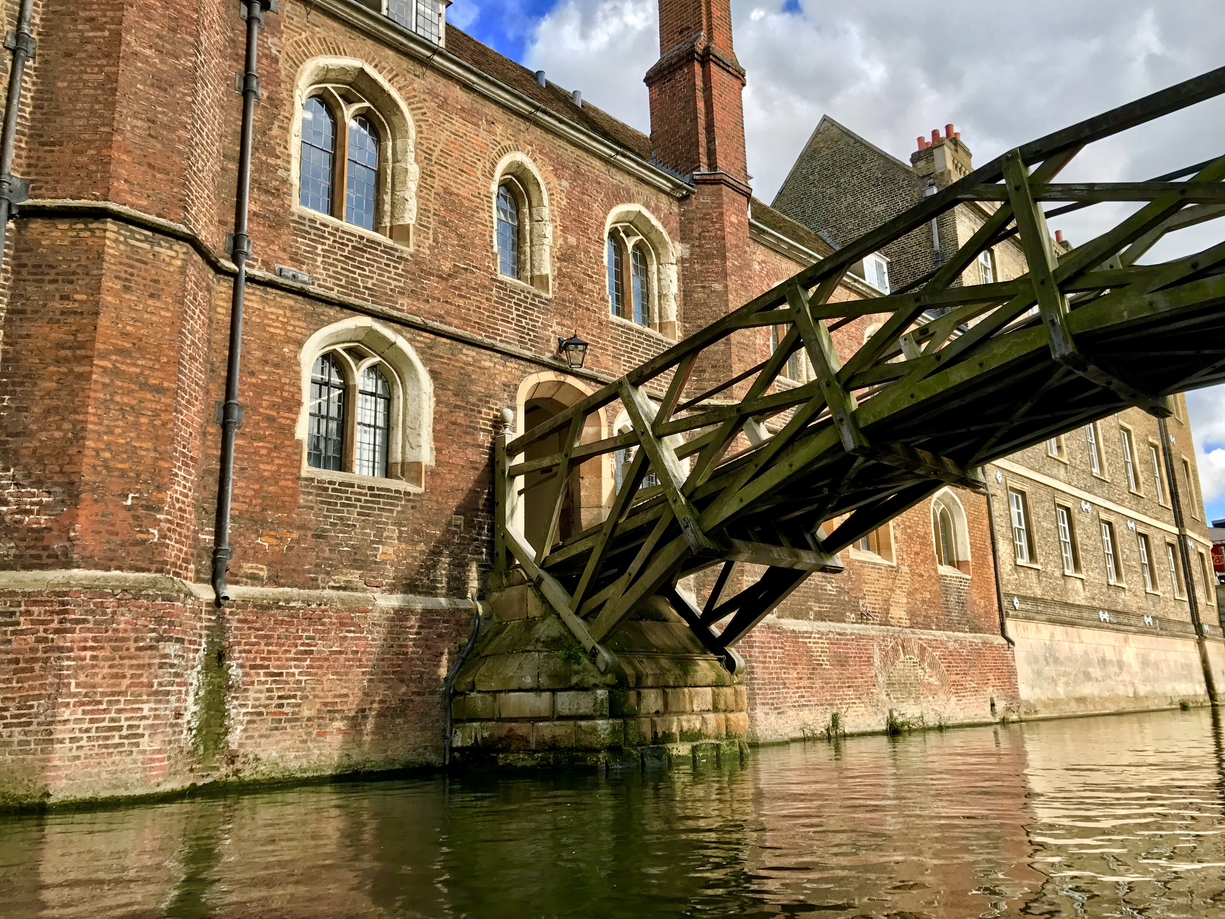 The mathematical bridge across river Cam is fabled to have been built by Sir Isaac Newton, though actually was built by James Essex in 1749, 22 years after Newton died in 1727. It is an unusually sophisticated engineering design – it appears to be an arch though composed entirely of straight timbers arranged in tangents.